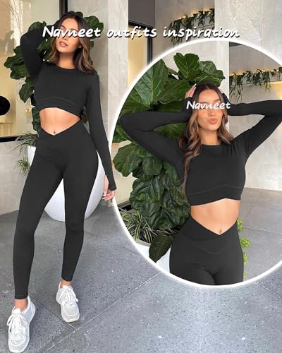 Navneet Women Gym Set 2 Piece Outfits Workout Set Crossover Long Sleeve Gym Tops Ruched Leggings Yoga Tracksuit Set